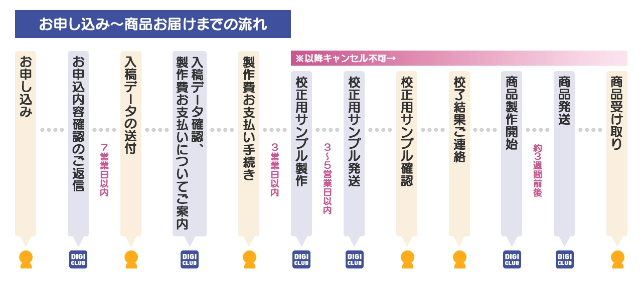 ※繁忙期(コミックマーケット等の大規模イベント等)につきましては、3週間以上の製作期間が必要な場合が御座います。